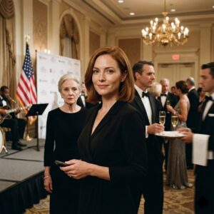 Behind her, the lobby glowed with warm chandeliers and polished marble. A concierge desk sat beneath brass fixtures, and a wreath the size of a car tire hung over the revolving doors. Holiday lights wrapped the columns, gentle enough to look tasteful, bright enough to feel like money. To the right of the registration table, an American flag stood in a metal base, the fabric falling in heavy folds. It was there like a stamp of legitimacy, like a silent reminder that the room was supposed to be about values.